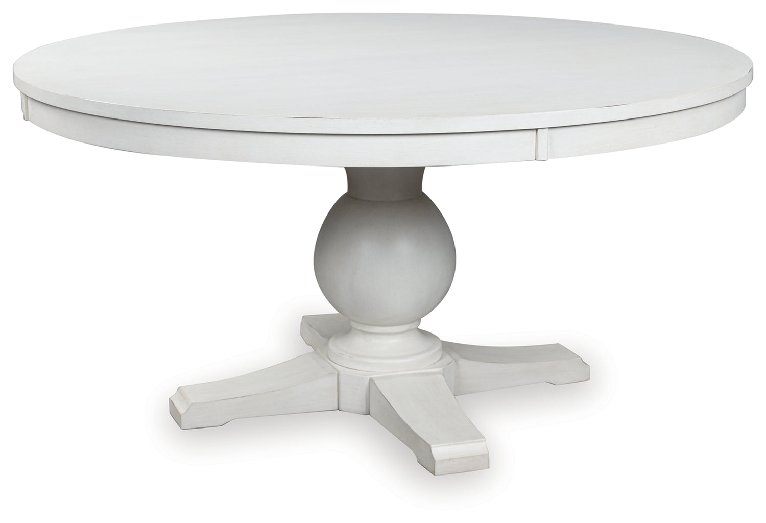 Relaxed living and cozy comfort—that’s what traditional farmhouse design is all about. And what better way to embrace your love of rustic country style than with the Chadworth dining table. Celebrating the beauty of simplicity, its thick antiqued white top and hearty pedestal base marry functionality with classic appeal for a fresh feel. This piece effortlessly pairs with assorted chairs in the collection for an eclectic look.