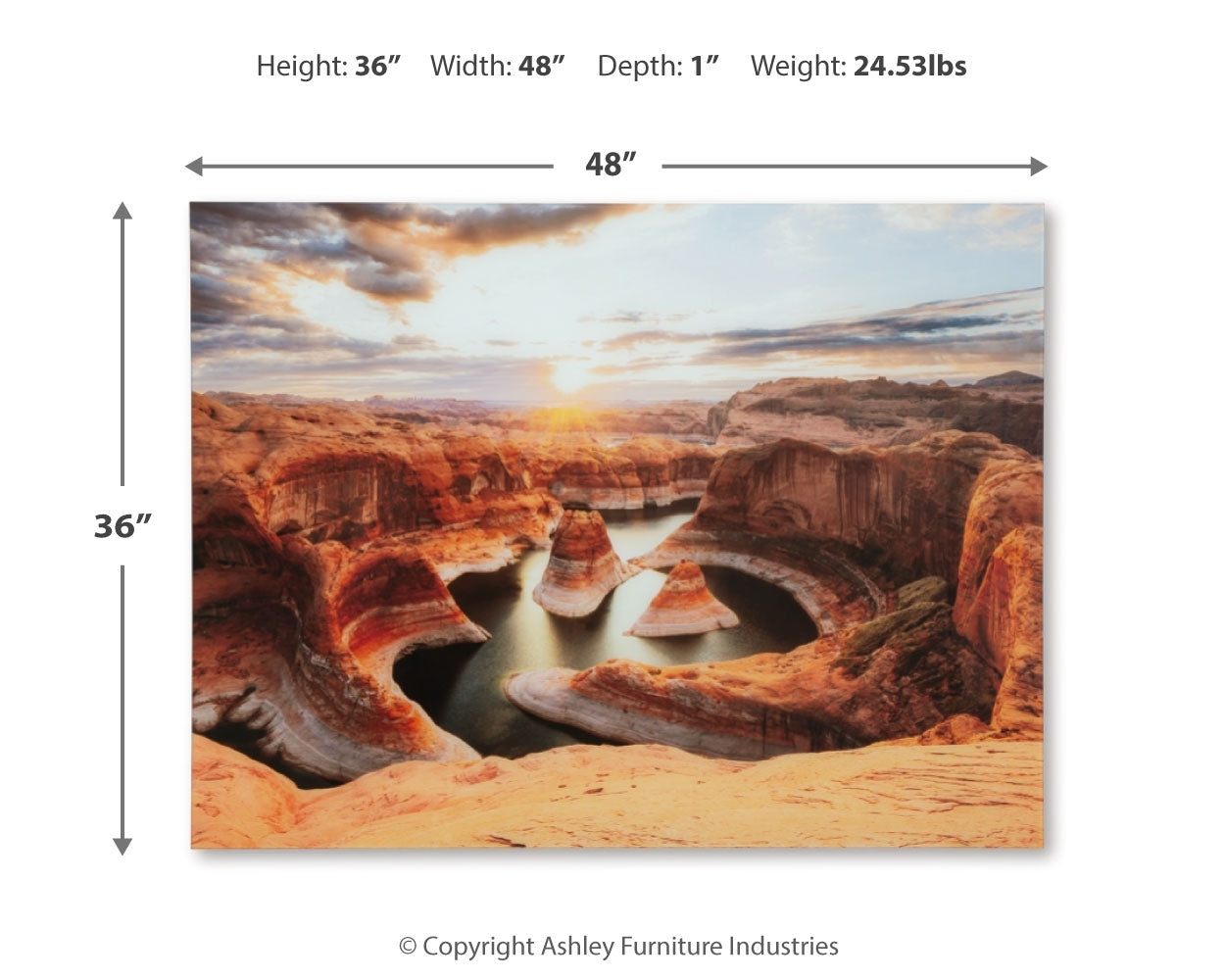 Immerse yourself in the breathtaking beauty of this print on glass. Capturing the serene majesty of sunrise over intricate canyon rock formations and tranquil waters, it brings the awe-inspiring wonders of nature into your home. This stunning piece adds a sense of adventure and tranquility to your wall decor.