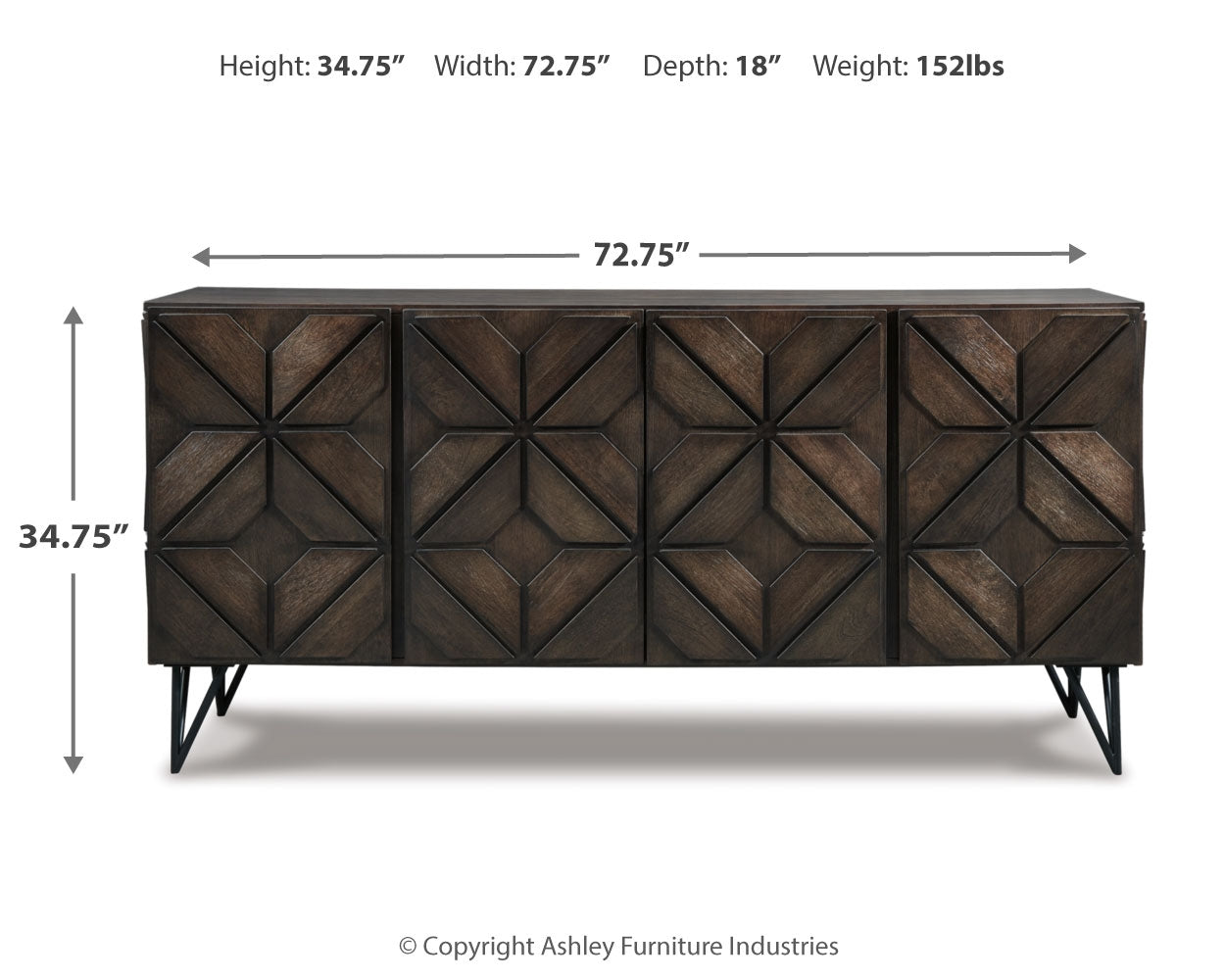 Entertain the possibilities with this extra large TV stand. Proving that furniture can be an art form, this sleek, chic cabinet stand—which accommodates up to 75" TVs—stands out from the crowd with a geometric overlay design that incorporates so much dimension. Adjustable shelving and cutouts for wire management make it highly accommodating. What's more, this TV stand works equally well as a dining room server or entryway console. How's that for staying power?